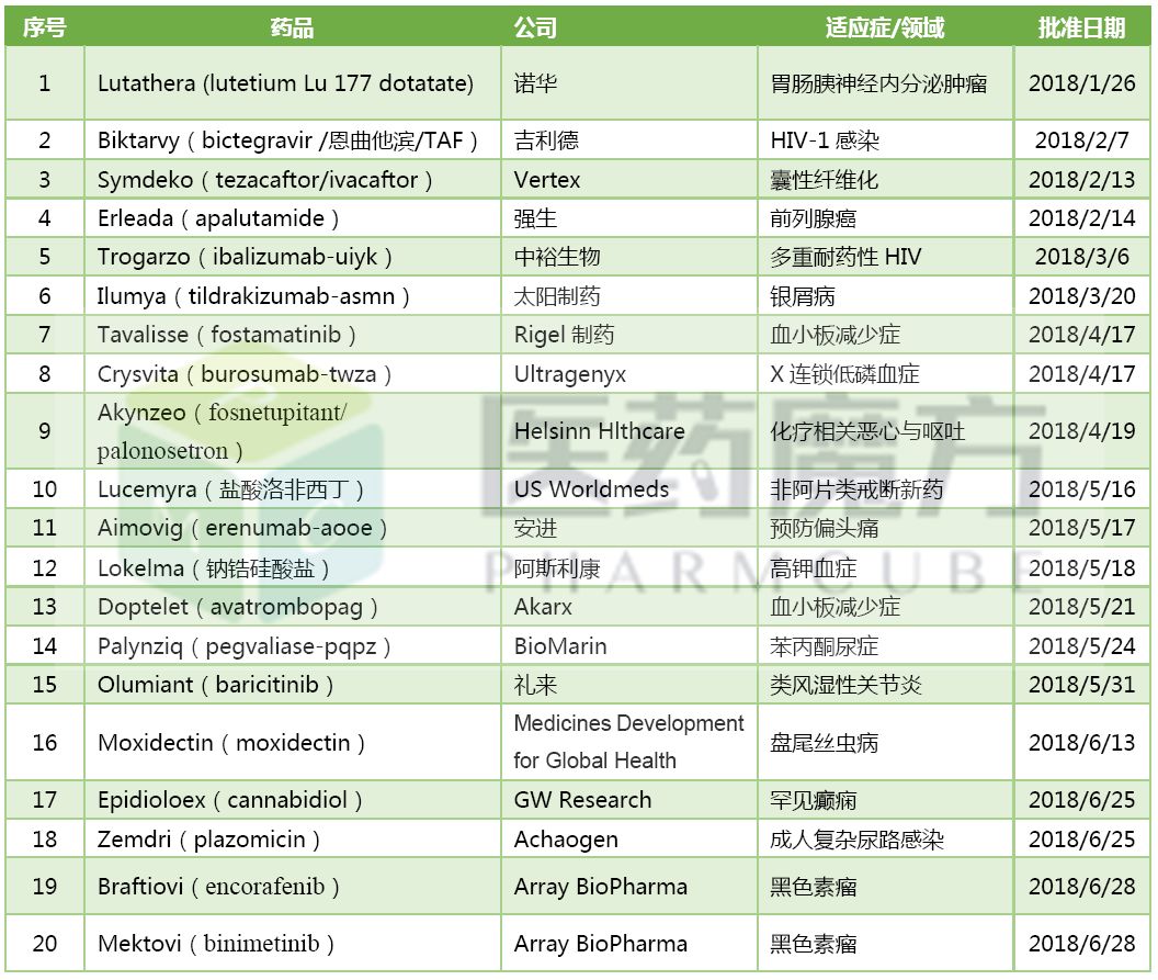 2018上半年,FDA共批准20个新分子实体和新生物制品,包括15个新分子实体和5个新生物制品。